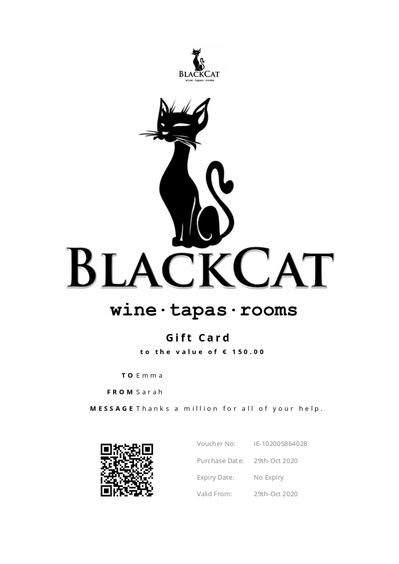BlackCat Restaurant allows you to purchase instantly printable gift vouchers, special offers and tickets using the Voucher Connect platform.